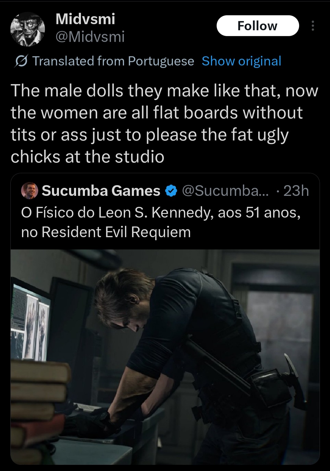 >>730976620Isn't the right a sequel to RE6? It doesn't make sense to compare him to REmake 4 Leon when it's the OG Leon aged up.