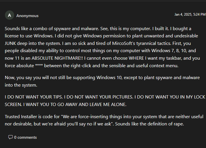 Actual question: when the whole Windows 10 EOS thing happened, everyone made a huge fuss about having to switch to Windows 11. Now all this stuff about W11 being garbage is coming out. I never upgraded to 11, why would I even consider doing it now? If I’m not a retard who goes to scam sites and gets viruses, why should I ever change from W10?