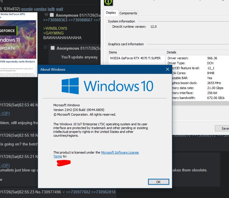 >>730977359I installed whatever the most recent win10 LTSC version was available when I built my computer like 3 years ago and literally haven't updated anything on it since.I will vehemently resist any form of automatic update for as long as I can. I do not fuck with anything that already works.>but muh security updatesif Microslop cared about my security they wouldn't bundle security updates with feature updates.