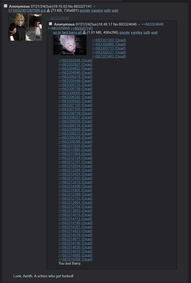 >>731014078>B-b-barry doesn't exist.Yes you do, Barry. You have been shitposting about Final Fantasy for many years for years. You even attempt to pose as a group with incessant samefagging.