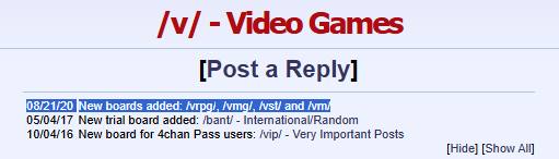>>731001813Years ago, 2019 maybeI think it was around the time someone asked Abib why he kept deleting Lobotomy Corporation threads but was fine with Smash having several threads up at any given time. The "Smash is a cultural phenomenon" thingAnyway they added /vst/ probably for that game specifically, then /vrpg/, /vmg/, and /vm/