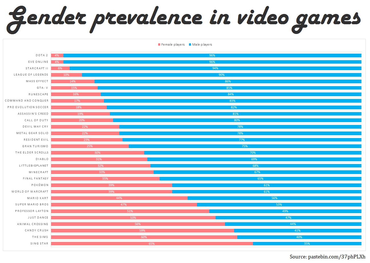 >>731003413Yeah, don't listen to charts like this, for one more men play the Sims than you think despite it being IMVU single player for women, but also it's comparing the most popular games based off limited replies.I can tell you off the bat right now, GTA V, DMC, Resident Evil, Assassins Creed, TES, Pokemon, and Final Fantasy are all at a hard 50%. You should be ashamed for posting this. This is why the only way to answer this question is intuition and knowledge.