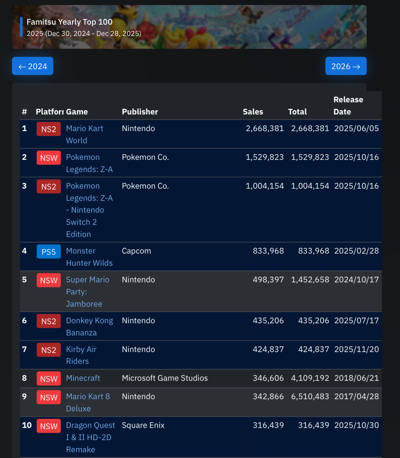 11. [NSW] Super Mario Party Jamboree (Nintendo, 10/17/24) – 4,654 (1,469,141)12. [SW2] Super Mario Party Jamboree – Nintendo Switch 2 Edition + Jamboree TV (Nintendo, 07/24/25) – 4,157 (149,493)13. [NSW] Super Smash Bros. Ultimate (Nintendo, 12/07/18) – 4,086 (5,866,193)14. [SW2] Hyrule Warriors: Age of Imprisonment (Koei Tecmo, 11/06/25) – 3,752 (161,436)15. [NSW] Nintendo Switch Sports (Nintendo, 04/29/22) – 3,679 (1,686,832)16. [NSW] Ring Fit Adventure (Nintendo, 10/18/19) – 3,028 (3,768,448)17. [NSW] Super Mario Galaxy + Super Mario Galaxy 2 (Nintendo, 10/02/25) – 2,914 (145,502)18. [NSW] Clubhouse Games: 51 Worldwide Classics (Nintendo, 06/05/20) – 2,801 (1,469,703)19. [NSW] Dragon Quest I & II HD-2D Remake (Square Enix, 10/30/25) – 2,613 (325,917)20. [NSW] Tamagotchi Plaza (Bandai Namco, 06/26/25) – 2,374 (225,305)21. [SW2] Dragon Quest I & II HD-2D Remake (Square Enix, 10/30/25) – 2,118 (143,306)22. [SW2] Tamagotchi Plaza – Nintendo Switch 2 Edition (Bandai Namco, 06/26/25) – 1,983 (92,833)23. [NSW] Splatoon 3 (Nintend0, 09/09/22) – 1,935 (4,508,025)24. [NSW] Run for Money: Hunters vs. Runners! Can You Win as Either? (D3 Publisher, 12/04/25) – 1,595 (9,500)25. [NSW] Pokemon Scarlet / Pokemon Violet (The Pokemon Company, 11/18/22) – 1,452 (5,657,261)26. [PS5] Ghost of Yotei (SIE, 10/02/25) – 1,415 (203,748)27. [NSW] Demon Slayer: Kimetsu no Yaiba – The Hinokami Chronicles 2 (Aniplex, 08/01/25) – 1,410 (180,647)28. [SW2] The Legend of Zelda: Breath of the Wild – Nintendo Switch 2 Edition (Nintendo, 06/05/25) – 1,341 (50,579)29. [NSW] Super Mario Bros. Wonder (Nintendo, 10/20/23) – 1,290 (2,060,492)30. [NSW] The Exit 8 / Platform 8 (PLAYISM, 11/28/24) – 1,241 (84,321)