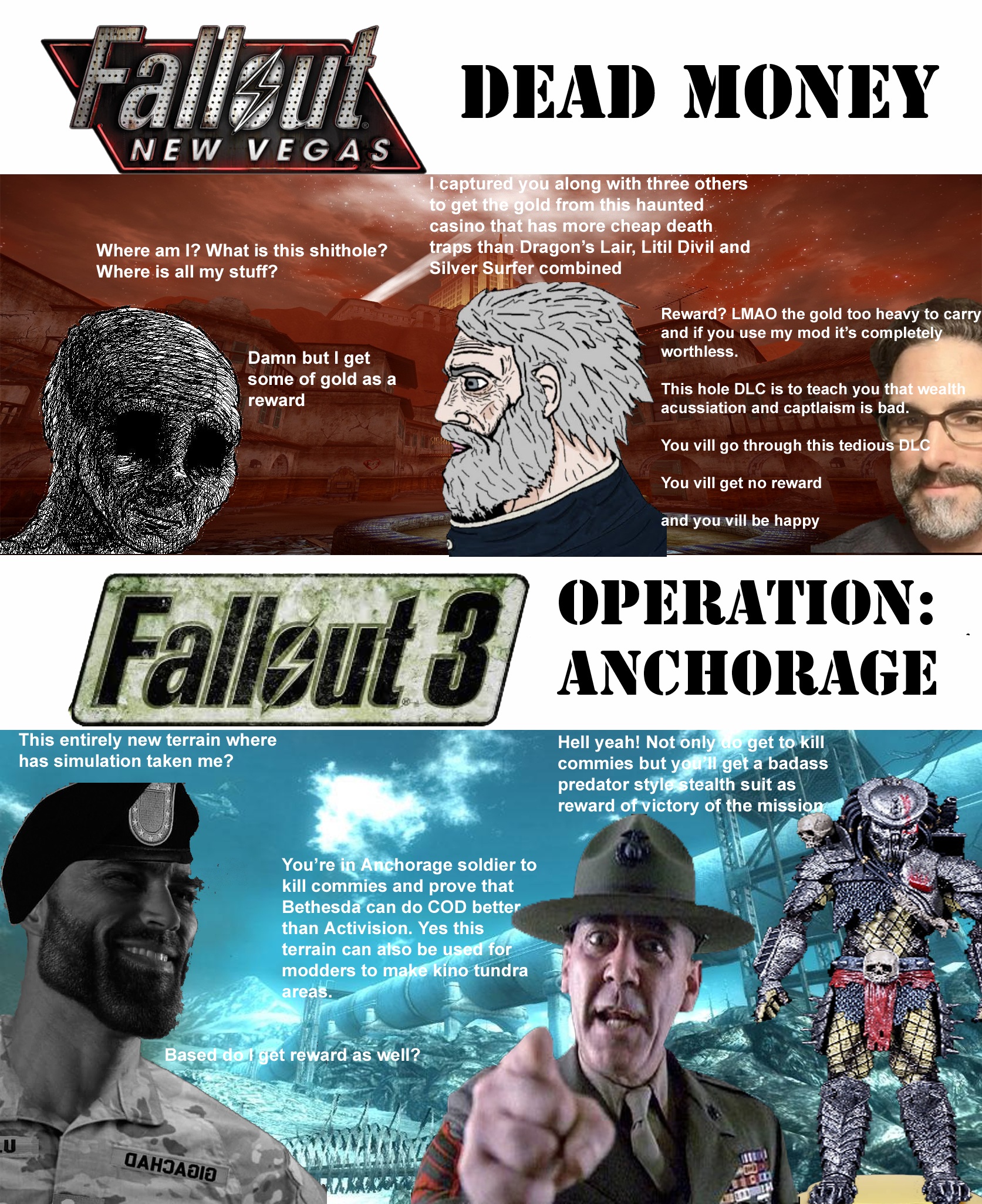 >>731031806You ignore the fact that Chadout 3 badasses have brought up many flaws of the game like it having no evil companions, no post game, no real legion route, most of the quests being helping the NCR again, most of the locations being NCR camps and the game being Antifa propaganda in general.
