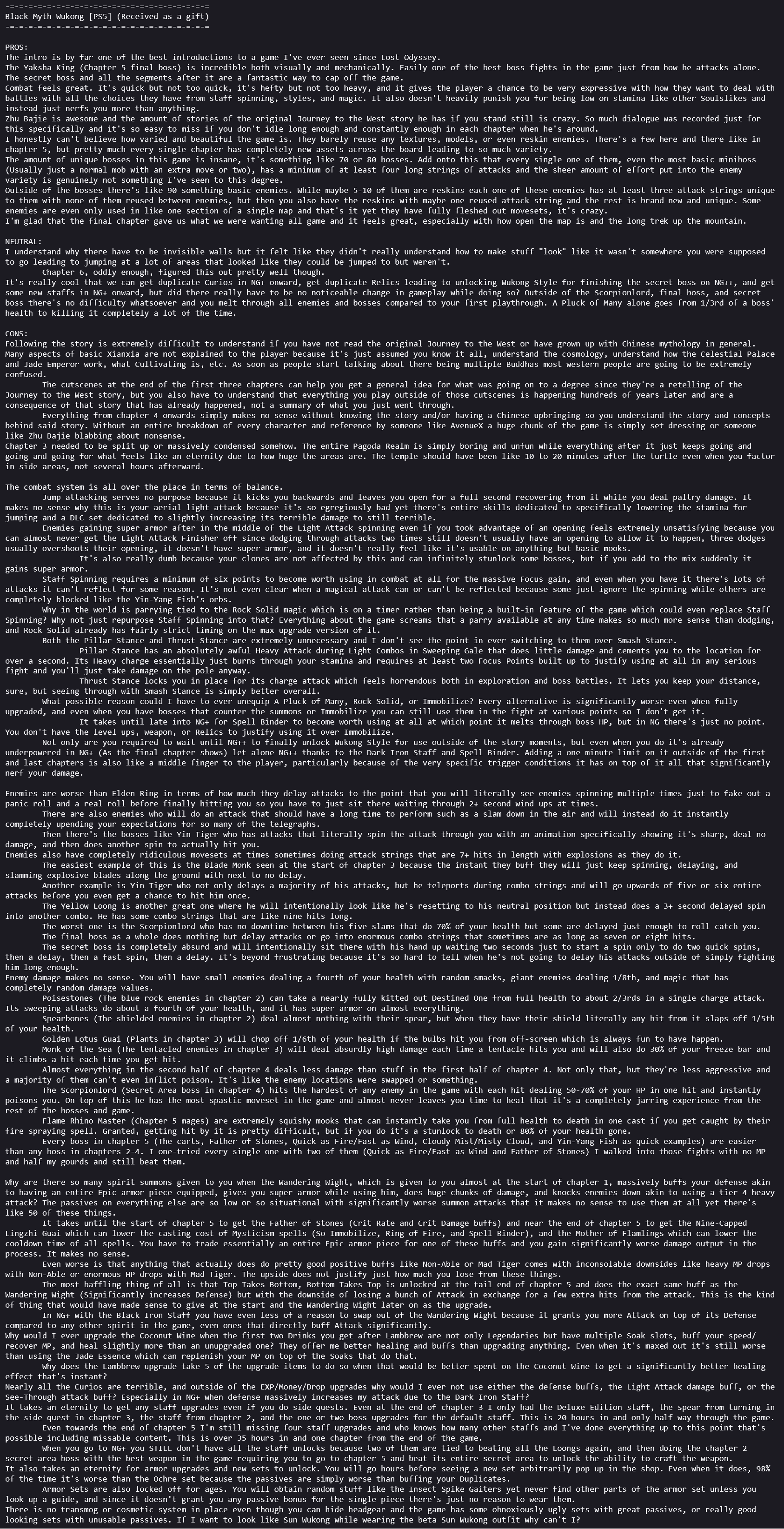 >>731040669>Is it worth $60No. It's worth around $40 though. >>731041114 This guy is either shitposting or delusional.The game's third chapter feels like it goes on forever and is by far the worst part of the entire game while the fifth chapter feels like it's overstaying its welcome. Many of the bosses feel more like lame minibosses than proper bosses, and it's one of the games that loves to throw multi phases on a lot of bosses for no reason. 90% of what you pick up is worthless and worse than early game outfits and equips because the early game outfits and equips have absurdly good passives to the point that I wore the Pluck of Many one until endgame. It's also extremely poorly balanced, requires you to go to NG++ to 100% it, and an unlock in NG++ (Your Wukong style) is worse than normal attacks once you reach that point so it's actually a downgrade for you to unlock it.The main impressive part about the game is how many unique assets exist across the entire game and that includes every single enemy having unique animations. It is also stunningly beautiful in everything but chapter 5. The only time it ever remotely becomes like Sekiro is a boss in a pond early in the game that has a few phases, and then the true ending boss. Everything outside of that is fairly easy and doesn't require crazy amounts of parries or even focusing on posture like Sekiro did.It's a solid game but you can clearly see it's got a lot of quantity over quality, and if you have not read the entirety of Wukong's story none of the game makes any sense. None of the areas, none of the characters, nothing. It assumes you have a Chinese-level understanding of Chinese cosmology, religion, and folklore since this is a direct sequel to the story.