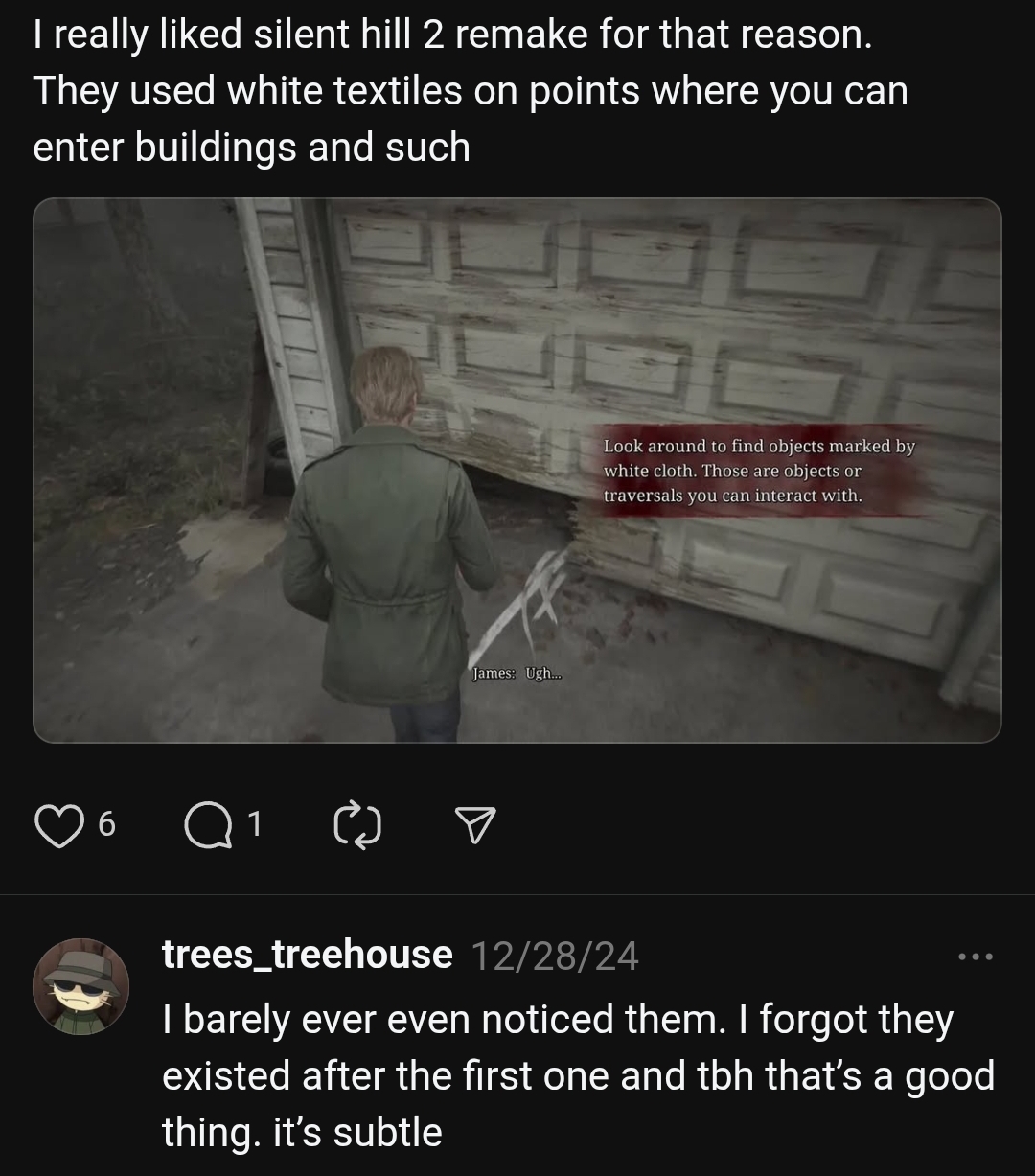Older games and recent hits like Silent Hill f used lighting to indicate where you're supposed to go. Yellow paint = lazy devs