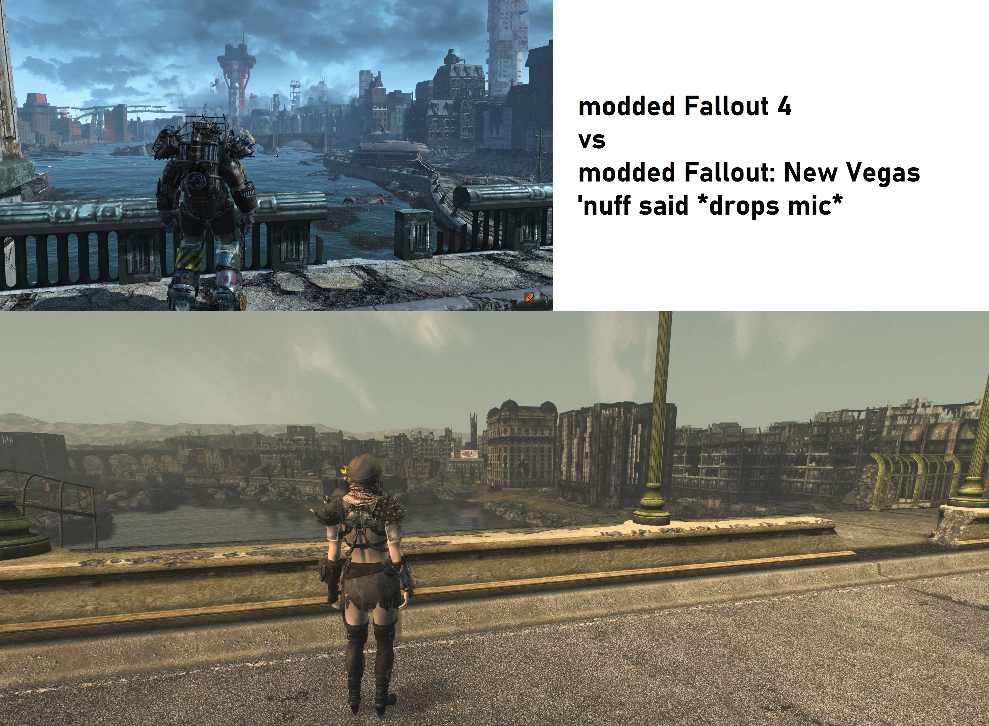 >>731061225>modded FO4: aren't even any changes from vanilla>modded FNV: modders actually ported the entire Capital WastelandWhat was your point exactly?