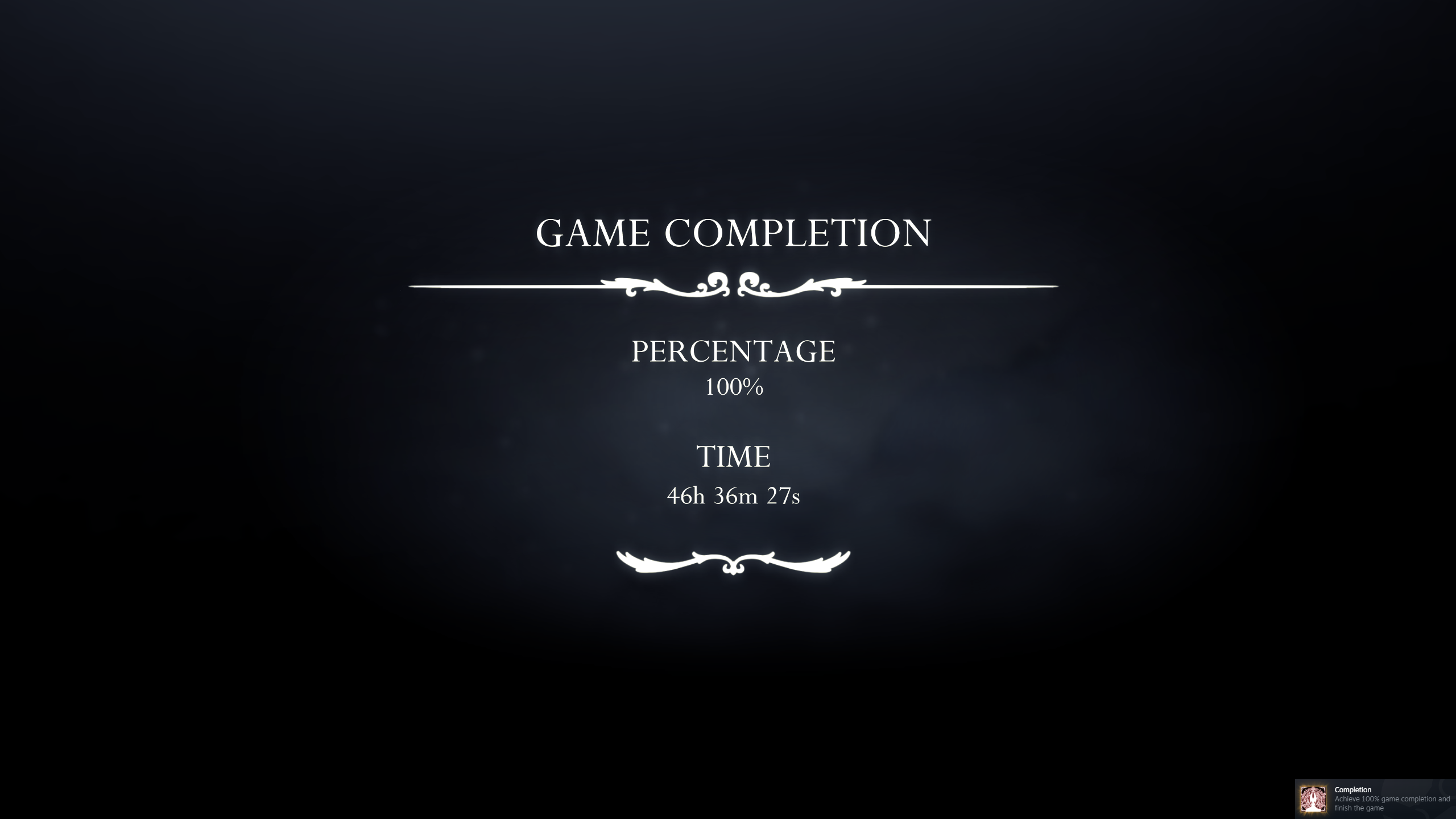 >got 100% in 45 hoursI don't know how it takes people longer, other than they run around in circles and don't do anything for 40 hours. Or take 30 tries for every boss fight.