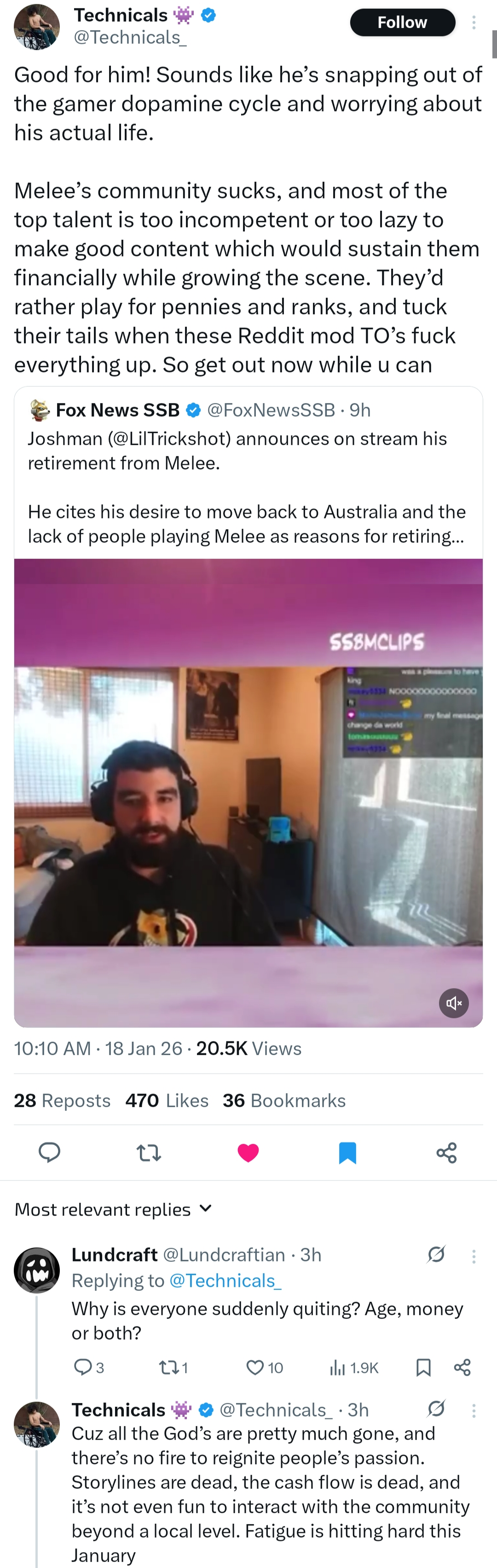 >Haven't played Smash competitively or interacted with the community since 2019>Pretty check on it from time to time like how friend checks on his old friend every few years or several months>Despite the controversy I heard Mang0 was in, I got weirded out by him playing LoL on my twitch feed>It turns out he's been out of it ever since and casually announces his retirement on stream>This account also confirms like 3 melee player retiring as well with one of them being aSMaSo is it really just joever for melee. I know Ultimate is dead asf after Nintendo told the community to get the fuck away from Evo but I never expected Melee to deteriorate like this. I guess niggas are growing old along with other complications to that. I remember somewhat laughing when I saw a Sm4sh commentator VikkiKitty commentating on a Marvel Rivals tournament I was watching at the time. P.S. how bad is the "trannyshit"? Was active from 2015-2019 as a smash 4/Ult player and while there was a slight growing uptick of them during my tenure, I never thought some ppl would cite them as one of reasons why the community has gone down the drain.