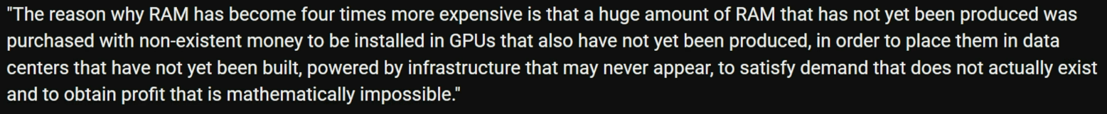 >>731082037>End of the year>CheaperLet me to describe just how FUCKED we are. The factories haven't even been built to manufacture the RAM chips that are already ALL purchased for data centers that haven't even been built yet. At this point, the best we can hope for is prices will simply stabilize by the end of the year. Waitfagging was always retarded, but waitfagging now is cerebral palsy behavior. Unironically take a loan out for this shit if you need to. The appreciation in hardware cost will likely be worth it.