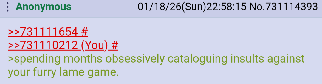 >>731111654>>731110212>spending months obsessively cataloguing insults against your furry lame game.