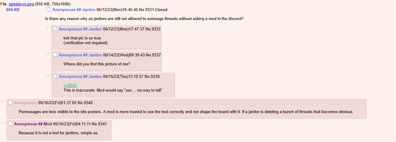 jesus fucking christ finally found it>>731130138, here. not sure if thats the truth, but thats what ive saw. i believe jannies just cry to mods for them to autosage the thread