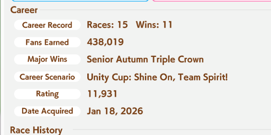 >>731104269>>731104409>>731104427>>731104438>2 Suzukas cancel each other outThat is not true, these are two Suzukas I trained recently: one has 502 stamina and 445 guts, and the other has 466 stamina and 449 guts. The latter one won.https://files.catbox.moe/mq4o5c.mp4This doesn't mean that she's broken, far from it. Based on my early testing, I think Oonige Suzuka will basically be a gambler next CM. If her acceleration skills don't proc at the right time, she can't build a sizable lead or win the race. Fronts, lates, and especially pace chasers will easily catch up to her if things don’t align perfectly.