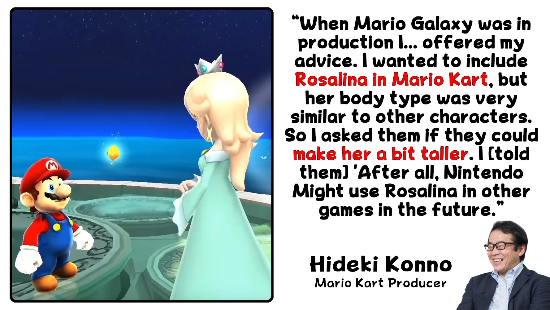 I didn't even realize Rosalina was a different character from Peach. I stopped caring about Mario and Nintendo after the N64 so only saw pics of her. Figured Peach just got a new blue dress or something