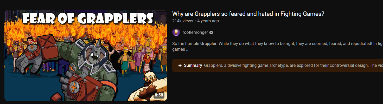 Nobody who thinks grapplers should be good has ever suffered even a mildly bad matchup against one. I've played matchups where I went to see a pro player on the other character give advice and they literally started laughing while going over my character's options but I still enjoyed it more and thought better of the players than the somewhat disadvantageous grappler MUs I've had.
