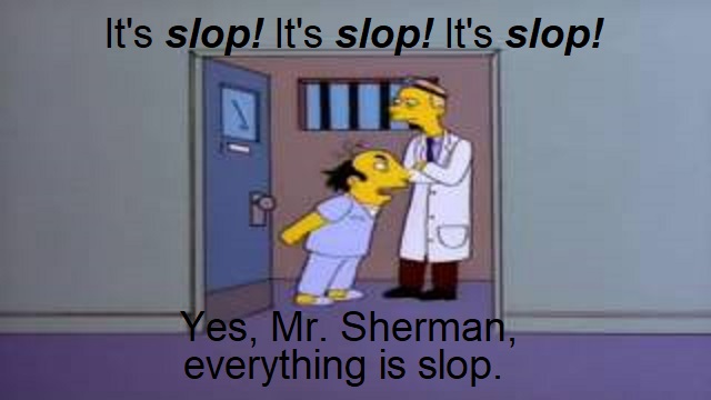 >>731167162yes slop is a current in trend word of the internet. or what you want me to be more vulgar and say shit? we wuz kangz n shietas if the word shit didnt get over used 5 years ago
