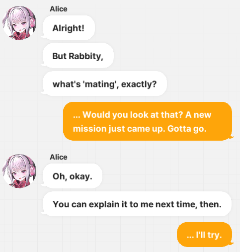 >>731252443...I seem to recall some blabla chat with Alice where she asked what mating was