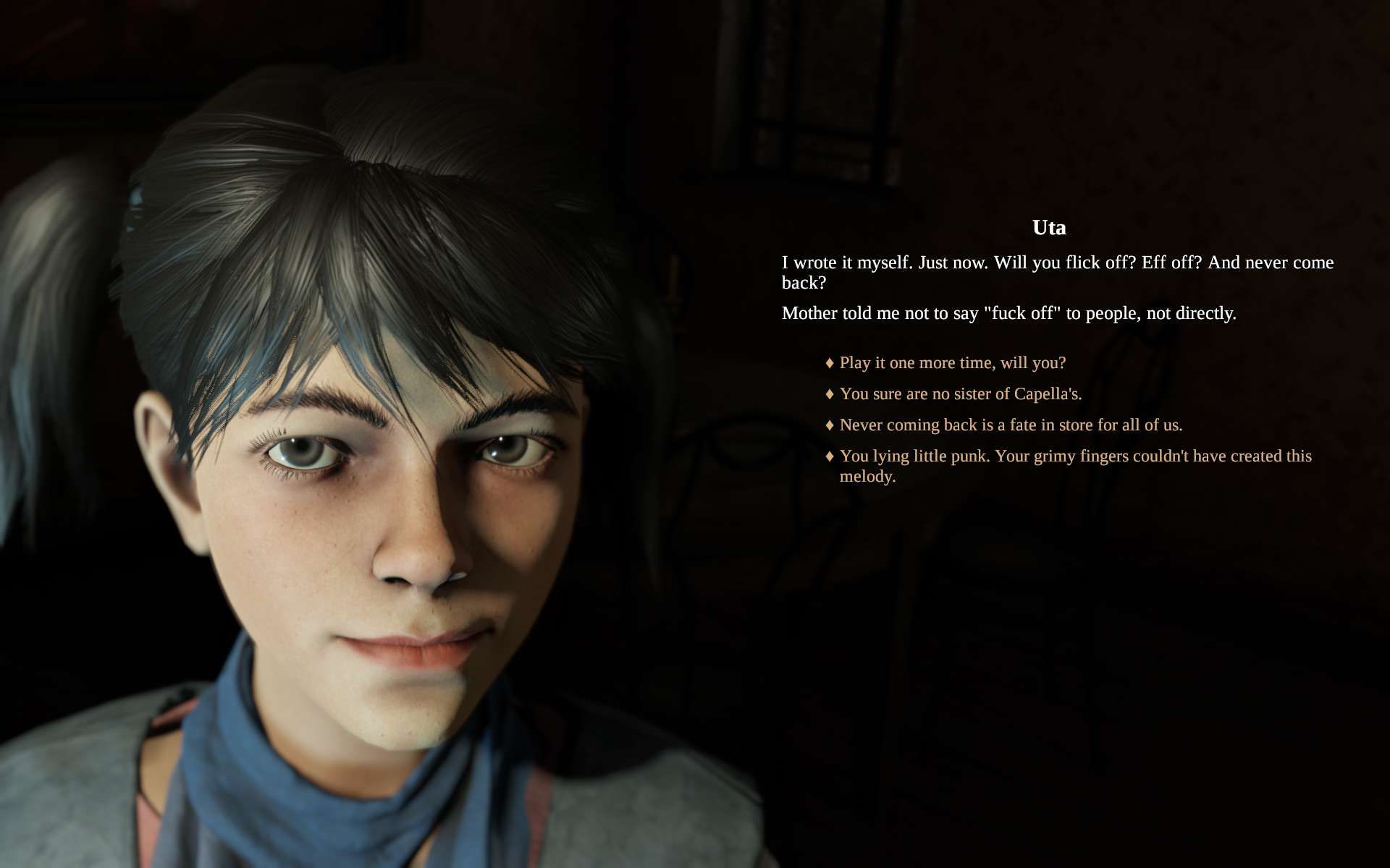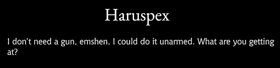 >>731347226>>Only the purest Ayrean blood could could concieve such homoeroticism. Bruh.It's to clue the player in on the fact that he's not actually a Patricidal serial killer.