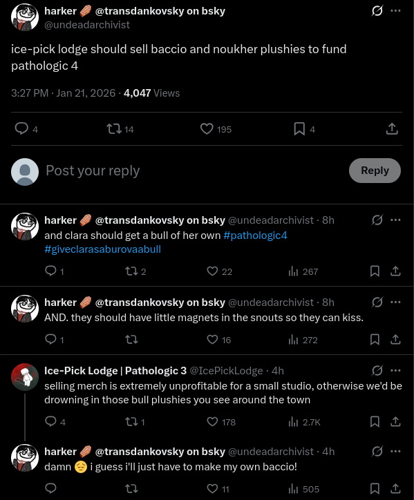 >>7312030522 is very different gameplay-wise, since the survival elements are persistent and you're dealing with a panicking economy sim (my favourite part of the the series desu which is absent in 3). You're also not running the town, and are instead focused on keeping key people from dying to the plague while looking for your own cure.As anon said the different characters have different perspectives, as well as their own approach to the cure. Haruspex is a steppe-adjacent medicine man so he's more focused on the mythology and alchemical type stuff. While Daniil is respected and aligned with the "Utopians" who are the elites like the Kaines, Haruspex is initially hated and slums it with the "Termites" who are the kids which have more to do with the underbelly, and the kin obviously(Although those are P1 terms and I can't remember if 2 refers to these factions explicitly. btw Clara represents the "Humbles" who are the scum and apathetic types.) The major events are the same for the most part but the actual story you experience, characters you interact with the most, and the resolutions are therefore very different. Stuff that happens offscreen in 3 is probably shit you do in 2, for example, and what actually goes down might be quite different from what Dankovsky hears about.Don't play Pathologic 1 though. I'd recommend everyone start with 2, which is basically a remake. 1 is very slow, yet very easy, and only for purists or those of us who played long before 2 existed, which does basically the same shit but better (although the aesthetic differences are a matter of taste).