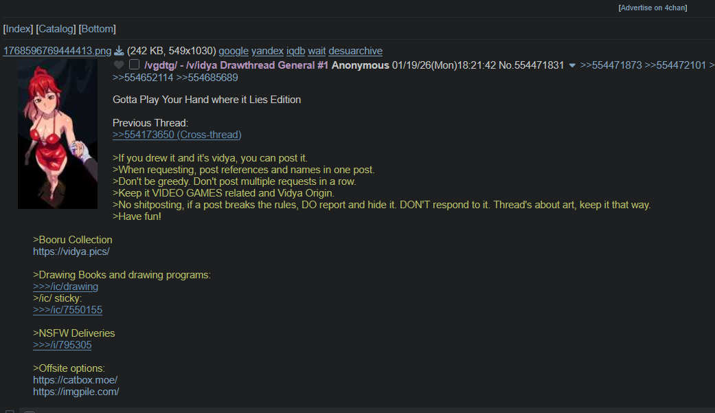 I would be more outraged about this, but the last few times I went into those threads, like 85% of any given one (aside from the porn requests, but those had always made up the majority of those threads) was made by two or three schizos accusing each other of shitting up the threads or colluding with mods or something.I feel bad for the people who just want to post their art or talk about it, but the overall state of the threads was legitimately abysmal.I doubt it, but maybe those schizos can be contained to /vg/ and new, better drawthreads can arise here in time.