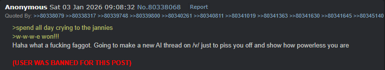 >>731328669It's cheap and dismissive, once I see something "wrong" with a post, I give in to the temptation to engage which I am trying to work on because it's an existential problemDon't know if I've been here longer than you, but at a certain point the number of years become sad rather than entitlement to an opinion so I won't go thereThe real grim reality is that the rage of old held a purpose, to correct and reaffirm board consensus, to actually participate in that old hive-mind which did once exist. However, the third worlder filth that piles into the internet day by day isn't a part of that culture and can't conceptualize it and also isn't affected by aggressive language or anything because they are literally too stupid to comprehend it.That's not the full story thoughWe are seeing, or will see much more of in the future, pure actual AI content. If the brown is resistant to cultural correction by his incompetence, LLMs are invulnerableSo the retarded posting is on purpose, to distract and take control of old urges of the past that served a purpose but are quickly becoming vestigialThe letter casing is a big part of identifying that because while yes third worlders have bad english, the real reality is that I think the biggest repository of text to train and LLM on 4chan posting styles would rip from greentexts, which traditionally fail to use correct casing, especially at the beginning of new linesEventually they will overcome that limitation and train a new model, so even now frenzying about it is futile, but the chance to tell some fucking shitskin to get off the White net is worth a quick bad postBecause the alternative is looking at the infinite flagrantly terrible subhuman posts and doing the right thing and walk away, but when that's the whole website and you're stuck here forever, it traps you in a game where there is no winning move.