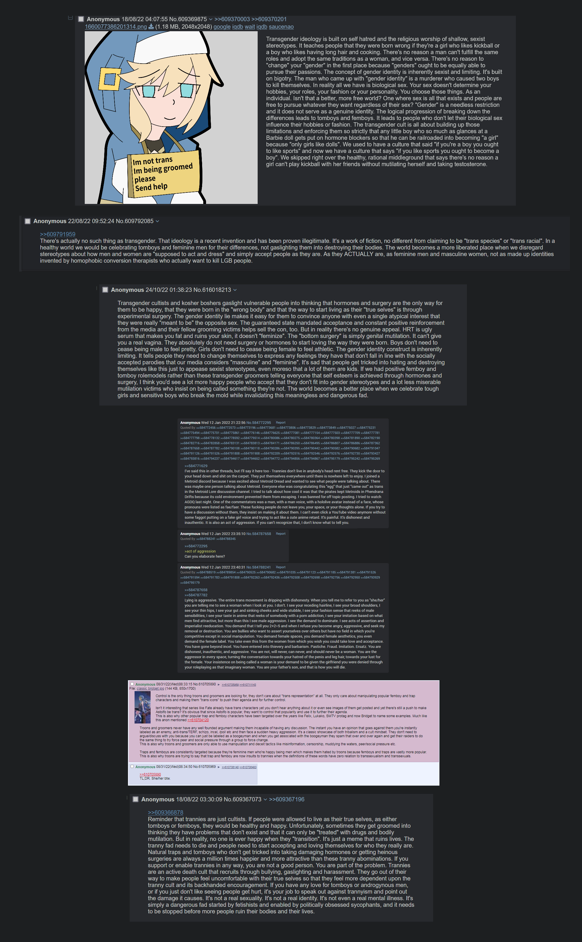 >>731375219So transgenders fall into three distinct categories, those categories being Sexual Deviant, Mentally Ill, and Victim of Grooming.>Sexual DeviantThis is the retard who gets off on the idea of being a woman and the worst perpetrator of this shit. Genuinely a disgusting creature who's using and actively harms others as a means to get themselves off in a public setting.>Victim of GroomingUsually a victim of the Sexual Deviant, they're usually someone who was originally uncomfortable in their body (As most people are at some point in their teenage years) or uncomfortable in their deviation from expected societal norms for their sex (A boy who likes fashion, a girl who likes monster trucks). They get groomed to believe they're trannies because of this, where they would otherwise have simply become tomboys or a flamboyant male. It is not neccissarily their own fault, but often they become Sexual Deviants themselves.>Mentally IllIndividuals who actually suffer from clinical gender dysphoria are the smallest group of the three, and while I could accept transitions for them if it were treated as a barbaric temporary treatment while we research an actual cure (There's been some studies to suggest the same treatment for Schizophrenia works), but we don't. Instead it's treated as the end all be all solution to the problem, often resulting in them still dying early. I do not hate them specifically, but they end up acting as the face of the systems they're a victim of, so unfortunately they tend to be the target of ire.tl;dr: Sexual deviants create victims and shouldn't be tolerated, while the mentally ill should be researched to find a proper cure.