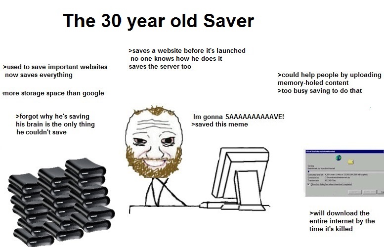 >>731415817>>731415974>bought 15TB external HDD last summerThe older I get the more I find digital hoarding justified. I've grown tired of my favourite contents being deleted from the web.