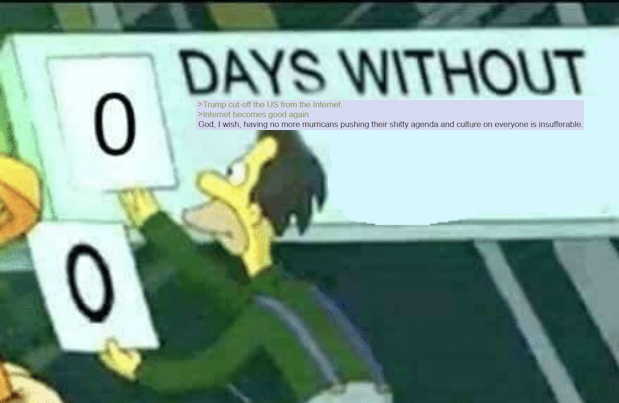>>731423645>Trump cut-off the US from the Internet.>Internet becomes good againGod, I wish, having no more murricans pushing their shitty agenda and culture on everyone is insufferable.