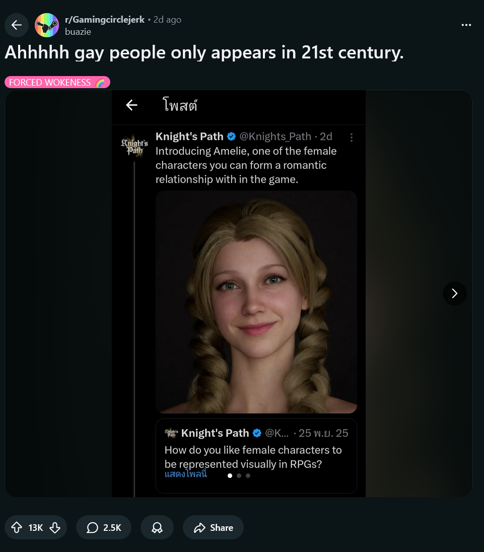 So basically the tourists who latched onto KCD after the gay retcon and now pretend it was always "theirs" are going around and demanding faggotry in other similar games, that about sum it up?