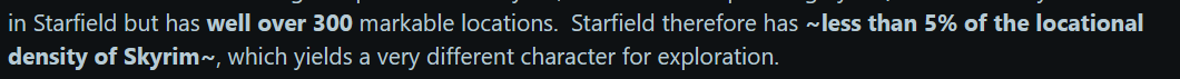 >>731591594>>731592060What they should have done is simple>Game happens in the same solar system with a small number of planetary bodies>Free flight in the solar system without loading screen, like say, Elite Dangerous (we know from mods the game can handle it), mix of handcrafted stations/encounters and some procedurally generated asteroids (everybody has the same "seed")>5-10 handcrafted areas across the various planets which are the only areas you can land on, each with amount of content similar to a Skyrim Hold or a DLC like Far Harbor or Solstheim>Some procedural generation is used on the periphery of these handcrafted areas to avoid having invisble walls.