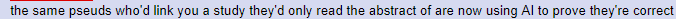 the same pseuds who'd link you a study they'd only read the abstract of are now using AI to prove they're correct and to think for them