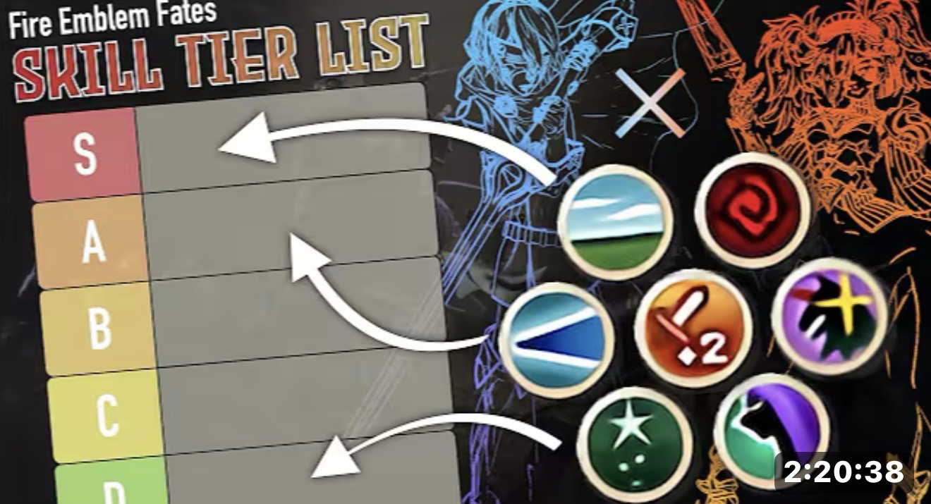 >>731586018> want to look up FE Fates Skill / Unit tier list for a refresher> Fucking 2 hours minimum> some even more more than one videoFucking why? Why such people like to yap nonstop? Get to the fucking point