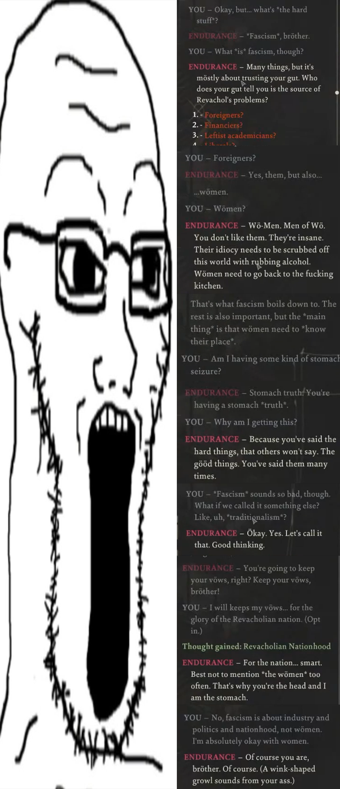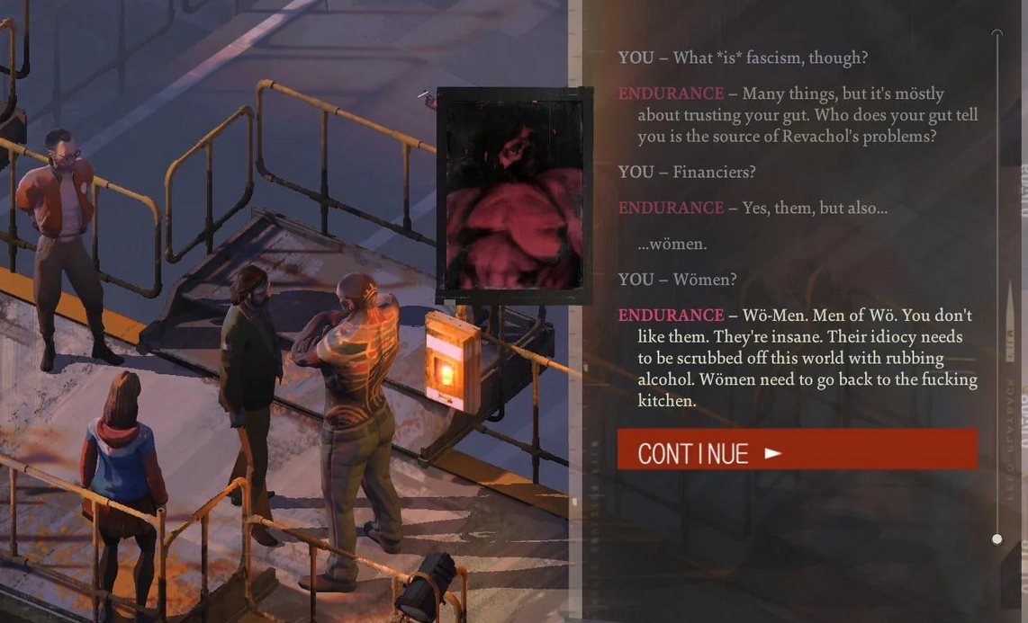 >>731659003It doesn't go into those ideas, or any really, because every single person who gives a fuck about those things is a deeply damaged coper holding onto politics to deal with other things wrong in their lives. Normal, healthy people in the game do not give a fuck about communism, fascism, or so on. They are apolitical, because they're busy just trying to survive. And the game portrays them as correct and you as retarded and weird for bothering them about politics. The only "normal" person with political opinions is Joyce, and she's her own odd case, because the commie devs decided to make the most charming, helpful, and intelligent NPC in the game a corporation's boardroom executive that actively fights against the improving of the lives of the worker.