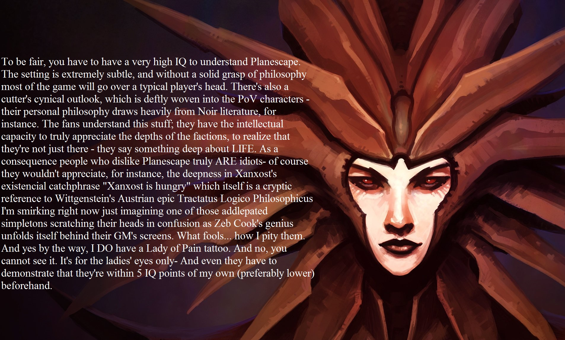 >>731624740KotoR 2 is just Max Stirner: The Movie. Chris Avellone is a competent writer on technical level, but his bag of tricks doesn't run that deep.PST is special, though, much like Disco. You don't have to agree with something to like it, either.