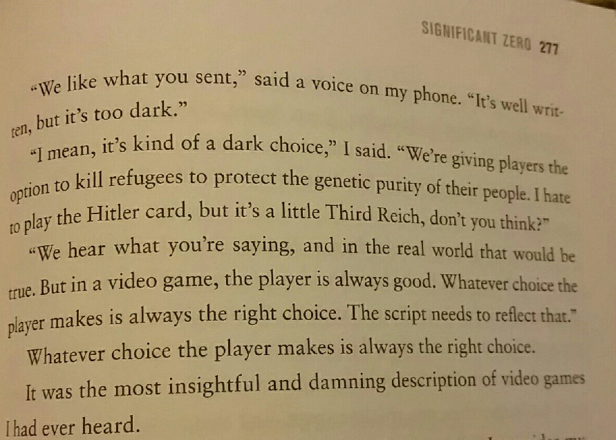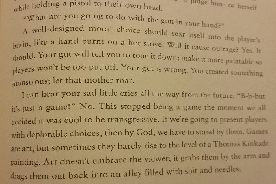 it's completely impossible for a choice in a game to feel morally significant unless you actually have the option to pick something else. Choosing to jump on the first goomba in Super Mario Bros instead of just jumping over it has more moral weight than being forced to fire bomb a village in The Line