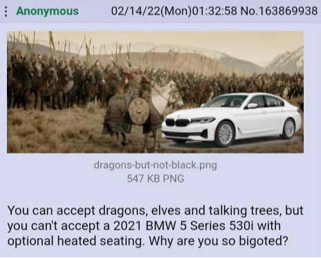 >>731680669If you have any kind of fantasy element that means you MUST accept everything we want to force into your game