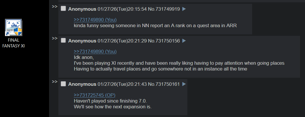 >And what about the story of the person who religiously defended an MMO expansion against any and all criticism, only for it to turn out he didn't play it himself? Couldn't possibly be true, right?>*Smirks*>This one's real. It happened on 4chan's /v/ board between 2024 and 2026.