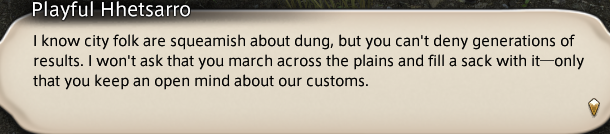 The Miqo'te went from having an interesting hirearchy with a "Nunh" (breeding male) surrounded by a harem of females and forming a clan to: generic tribespeople where both male and female are equal (of fucking course) as is shown with the hhetsarro. But hey, they use animal poop! Isn't that so diverse and awesome?I hate the ethics department.