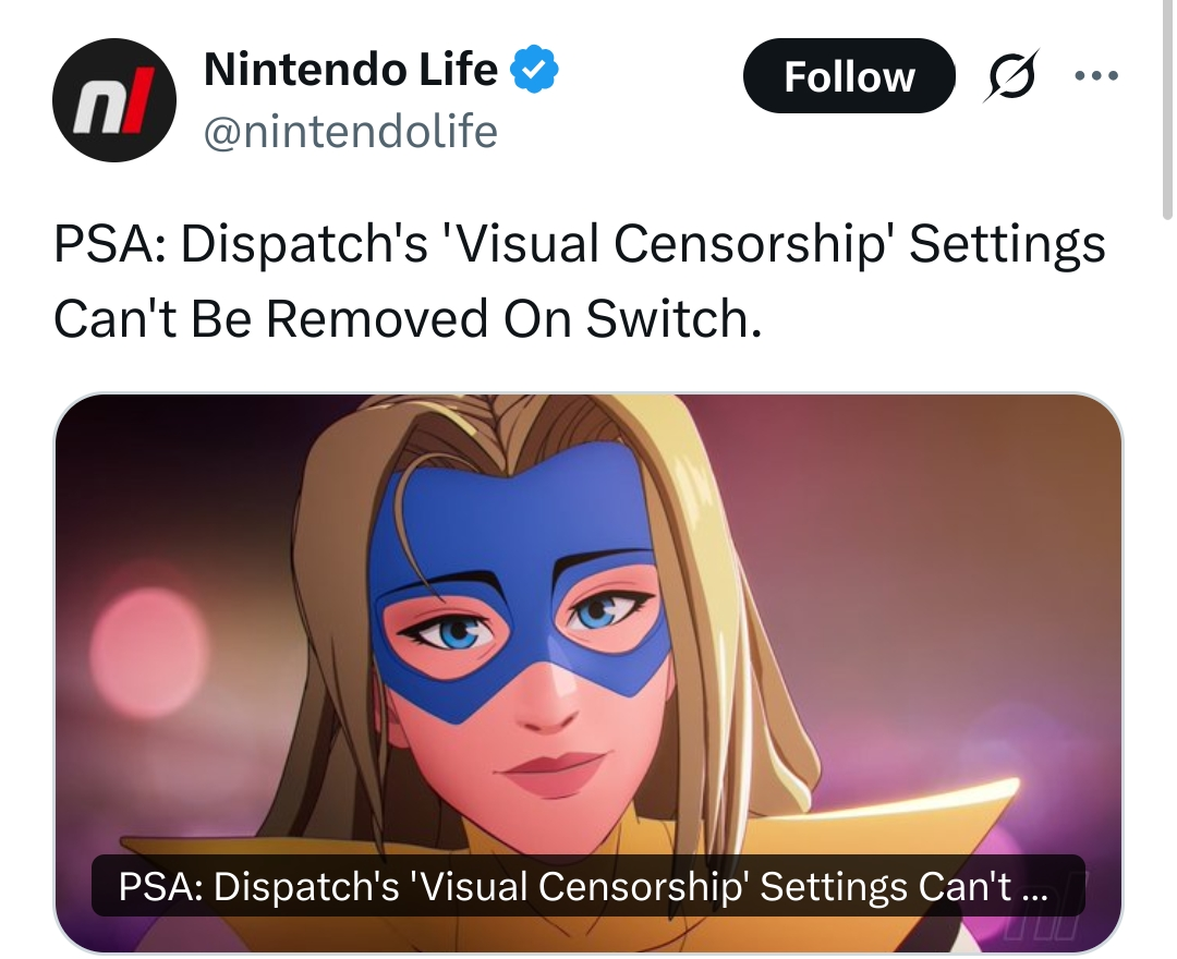 >nintendo lets Witcher, Cyberpunk and random hentai games on the switch/2>apparently insists dispatch is censoredYeah I'm not falling for the rage bait this time. Try harder next time ivan.