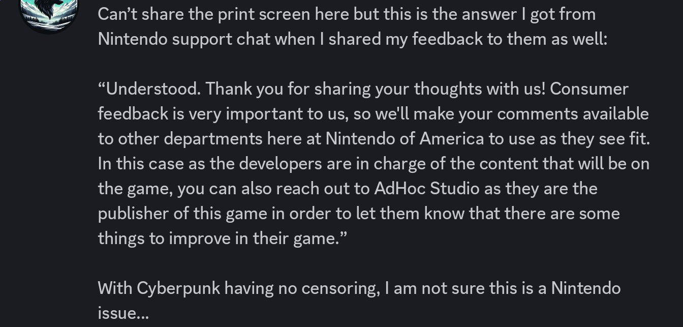 The reason Cyberpunk gets a pass as a recent Switch 2 release is because it was a "tech demo" port for the system, meant to show off its power (given that it was notorious for having high spec demands for its time) and greater push for third-party support (with CDPR and Cyberpunk being big names outside the Nintendo sphere). Bigger devs/IPs will obviously enjoy stronger immunity to non-agency content guidelines.