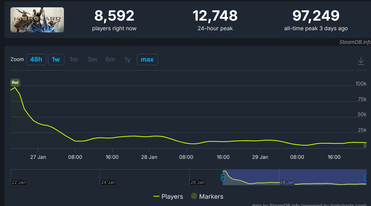 >talking about highguard losing 90,000+ players in 3 days to friend>"yeah well steam numbers arent really a good metric of the playerbase">point out how only 3k people are watching it on twitch>"we're not factoring in youtube viewers">tell him there's historic low ratings on the ps5 store for the game, which we dont tend to see except for ai games and the ps4 version of cyberpunk 2077>"lol, who cares about user reviews?"i think he's lost, chat.