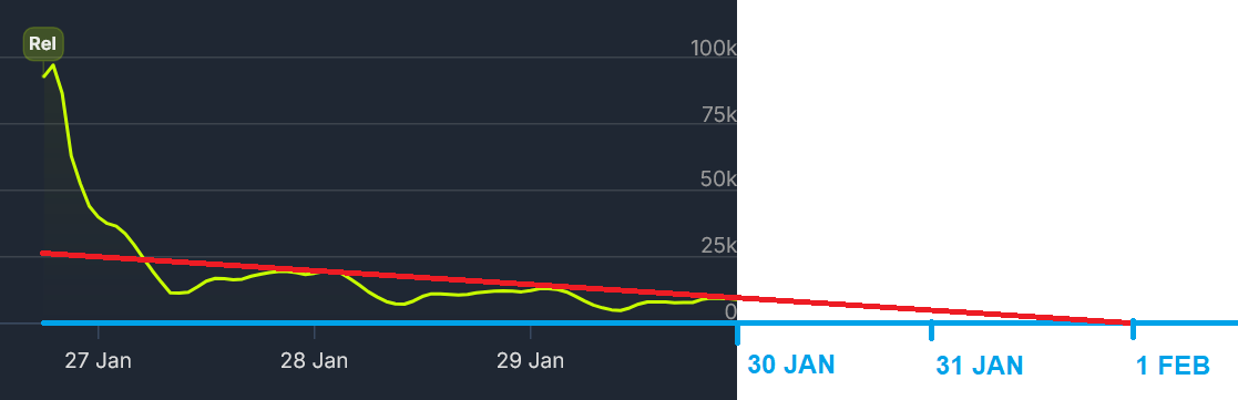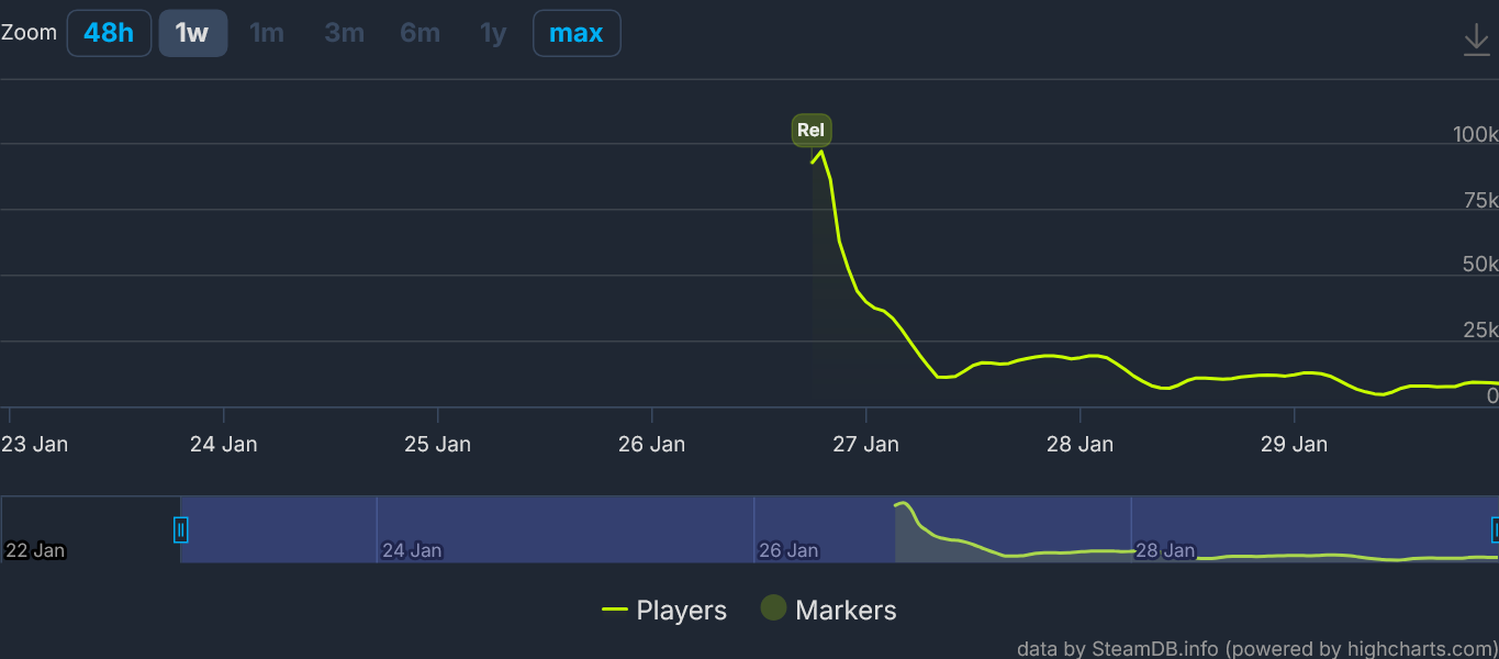 >>731883437day one: 97k playersday two: 19k playersday three: 12k playersday four: 9k playersthis game will die in a week from now