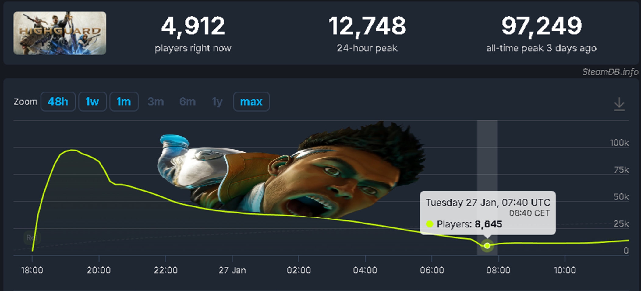 >>731914018I think it's only responsible for really negative reception and all-time peak. If the reveal situation wasn't so outrageous, then current concurrent player count would've been an all-time peak instead.