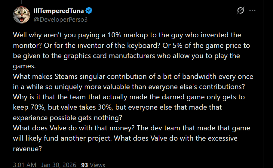 >>731924101He's right and we know this because valve offered better cuts to AAA games that actually had the marketing weight to sell elsewhere, indie devs have no real choice but to eat the 30%. This is a regressive tax on the poorest developers.