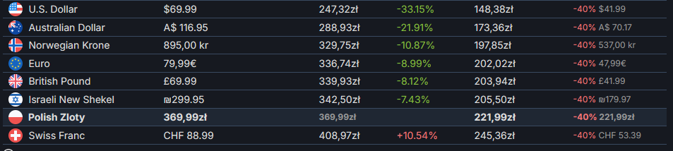 >default conversion STILL set at covid's 1usd - 5złThere's no point of buying directly from steam anymore.MGS3 btw.