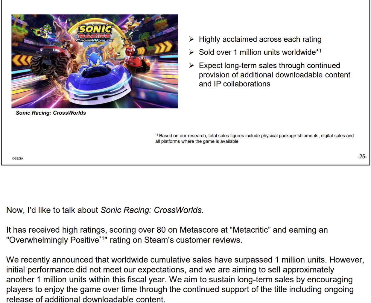 >"We recently announced that worldwide cumulative sales have surpassed 1 million units. However, initial performance did not meet our expectations, and we are aiming to sell approximately another 1 million units within this fiscal year. We aim to sustain long-term sales by encouraging players to enjoy the game over time through the continued support of the title including ongoing release of additional downloadable content."https://www.segasammy.co.jp/cms/wp-content/uploads/pdf/en/ir/20251107_q2_presentation_with_scripts_e.pdf