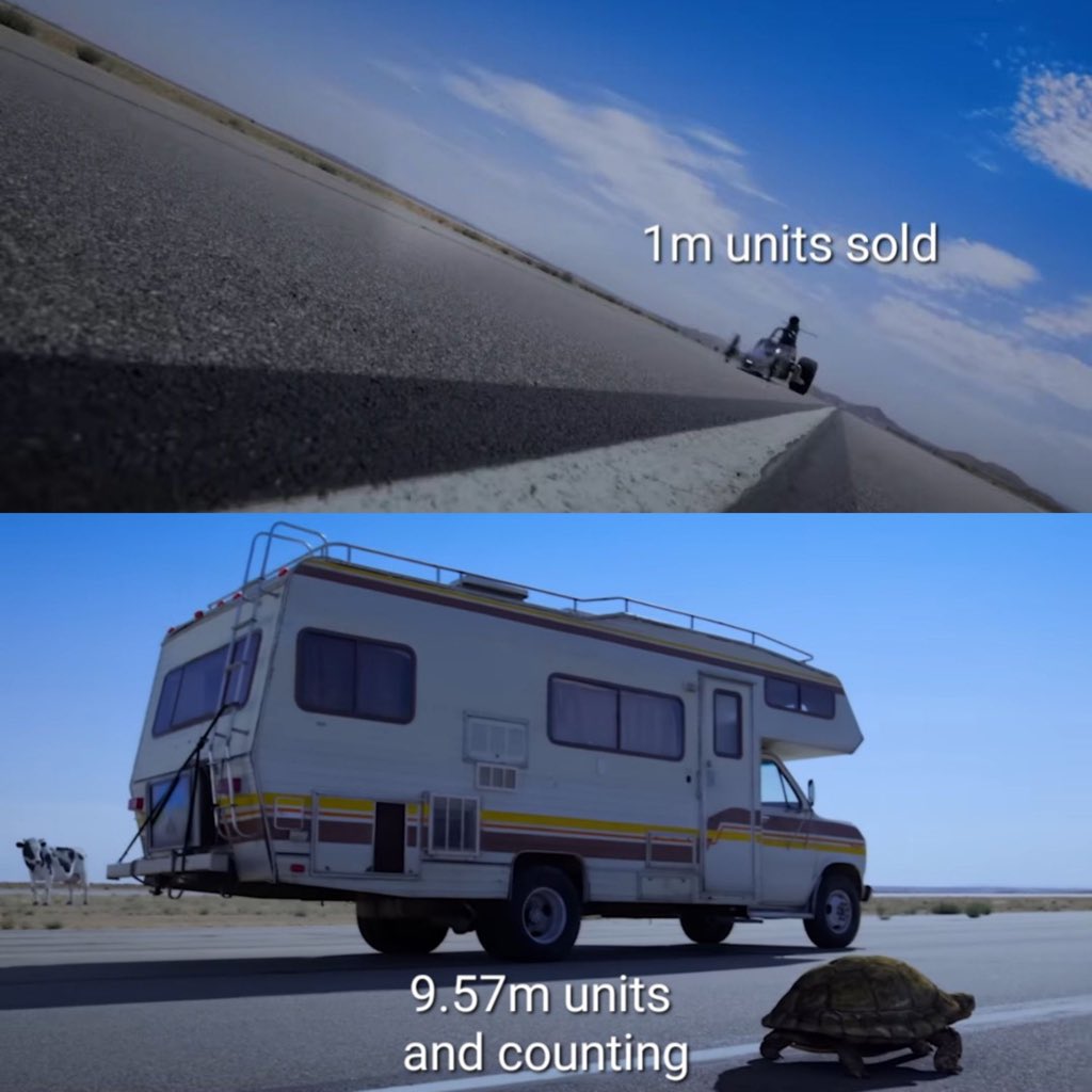 >>732133785It's also 1 million sales in 3 months plus a few days.Anons itt are comparing the game to the sales of shit like TSR already despite those being lifetime sales that accumulated over years of price drops and sales.
