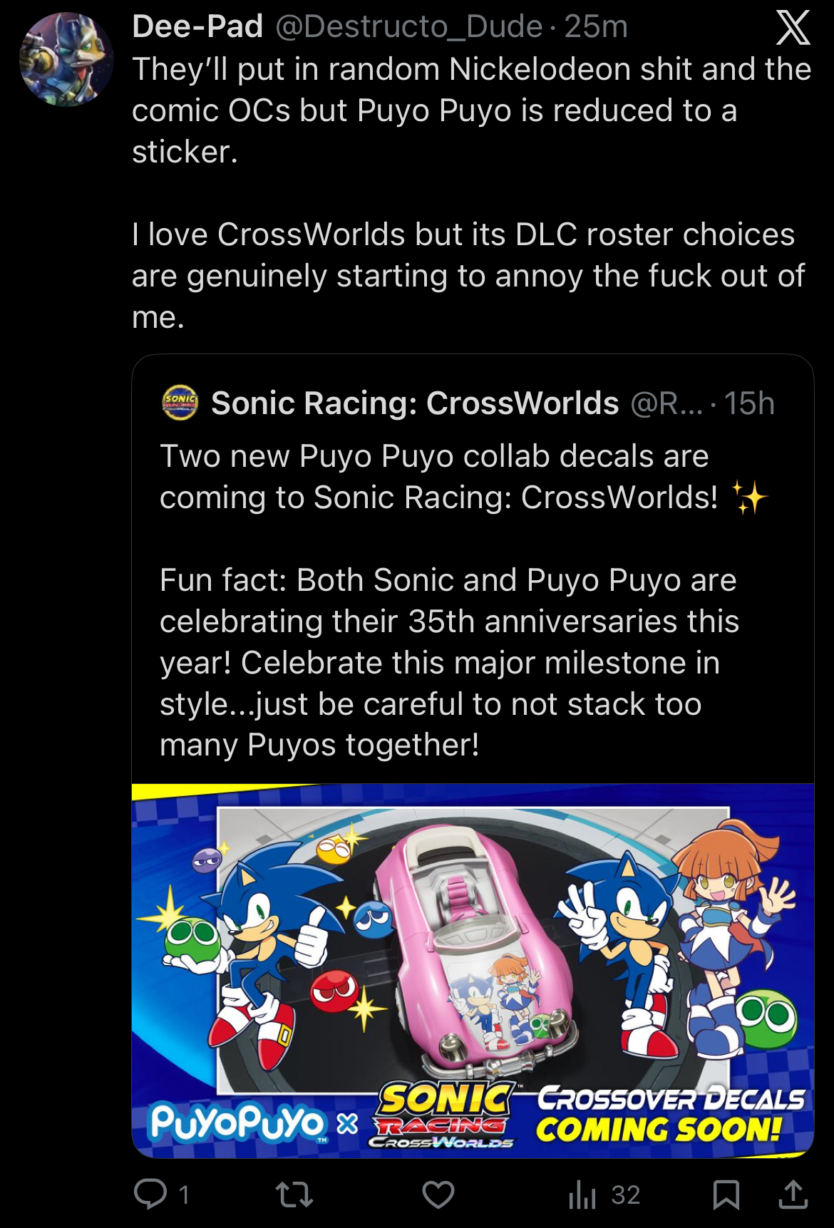 I had zero interest in this when Kirby Air Riders and Mario Kart World released in the same year.I don't feel bad for Sega because with the amount of day one dlc attached to this game they deserve to fail