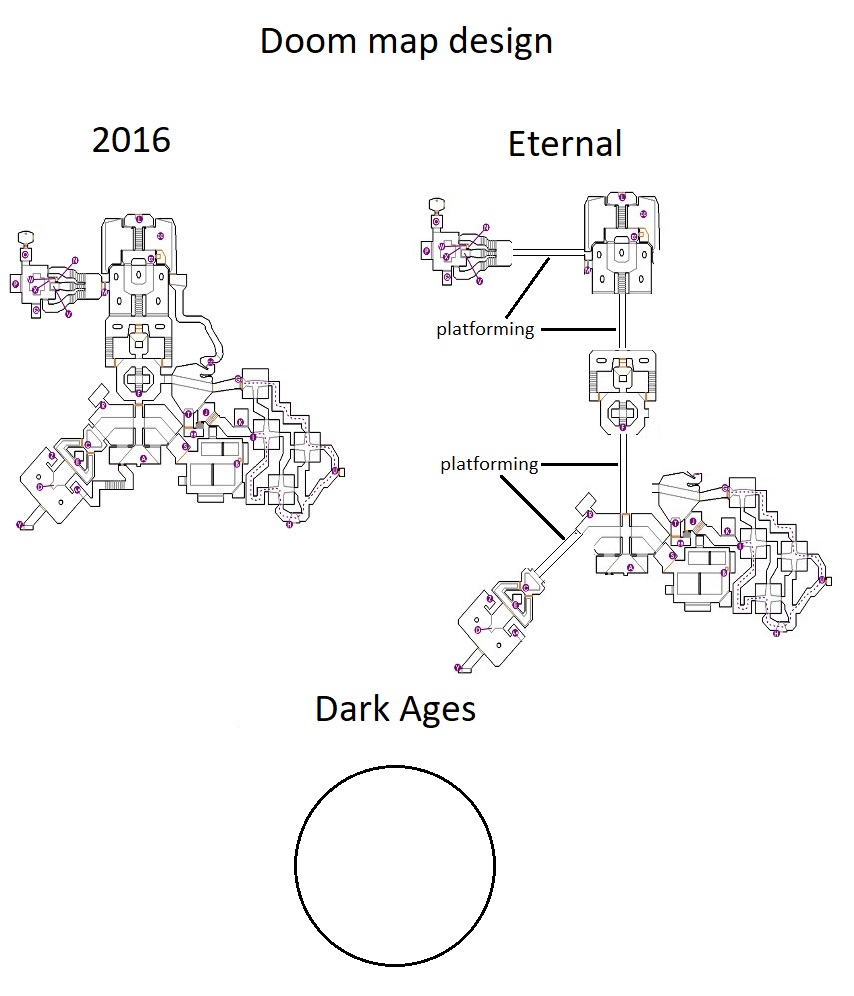 >>732164629Anon, both the images on the top are a map from Doom 1. In fact, a map that has a mandatory "lockdown battle arena" -that so many criticized Doom 2016 for. When you go get the first keycard in E1M6, a door shuts behind you and you need to fight a bunch of demons. Speedrunners kite an enemy to the door so it hits his head as it comes down and then the door goes back up and you can skip the fight.