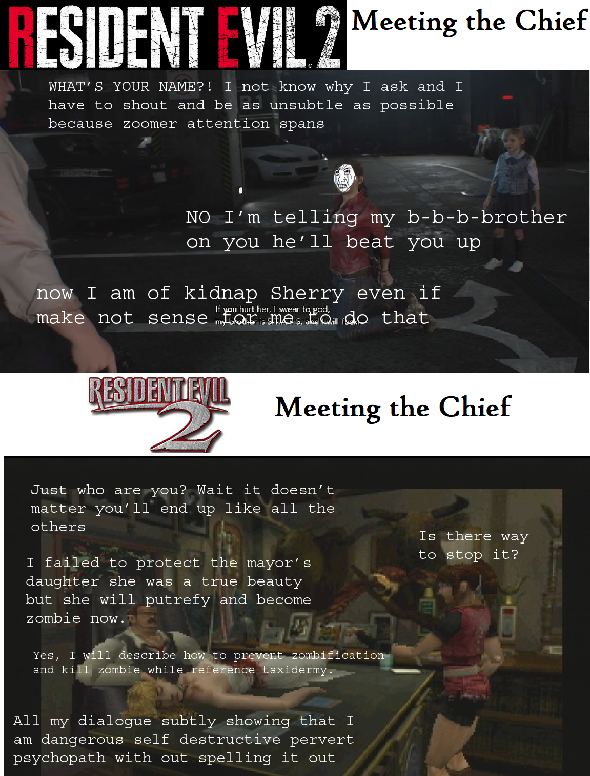 >>732188760>implying that having the villain call Leon every fucking 30 seconds doesn't completely kill any suspense and that sometimes less is in fact more>implying that you 'old good new bad' subhuman retards wouldn't completely lambast said conversations and shit on them for being 'millenial writing' or 'marvel slop writing' if they were reversed and they were exclusive to the remake